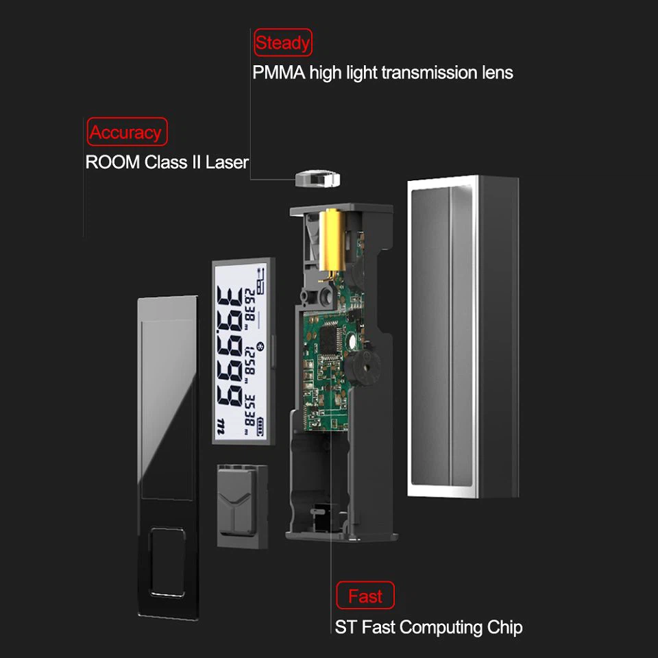 The Rangefinder can be widely used in construction and industries, especially in large areas such as rooms, apartments, buildings, real estates, factories, etc.