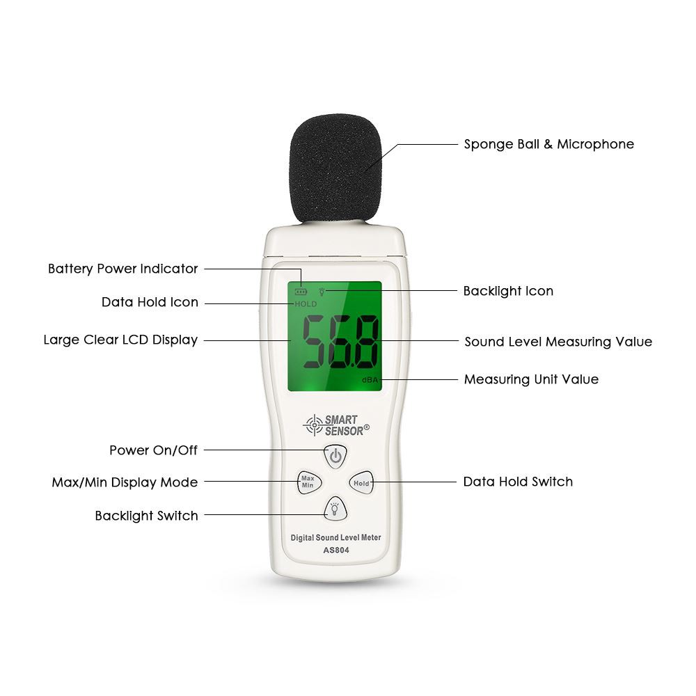 This noise meter is designed to test sound level in various environment. It is widely used in noise control engineering, quality control, health and treatment, home environment monitoring, etc.